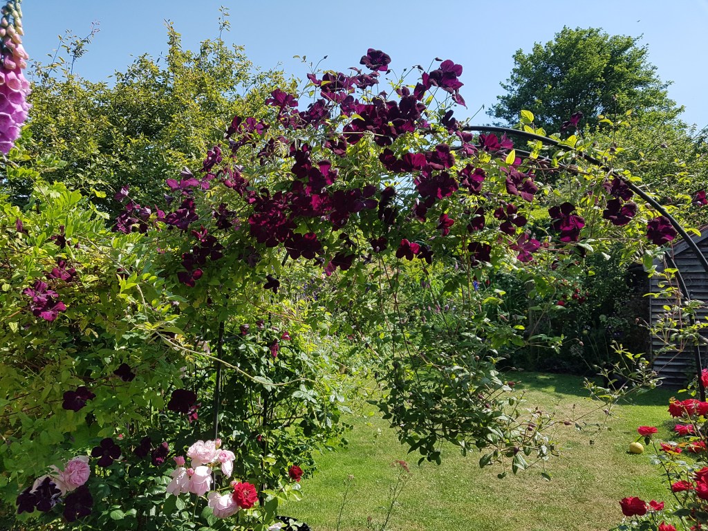 Fortunately, a look round the garden offers plenty to cheer one up: the roses are in full bloom in shades of red, pink, white and yellow (I heard that! There’s nothing wrong with yellow); deep indigo spires of delphiniums; jewel-coloured clematis wired to walls; glossy, rich crimson Turk’s cap lily (Lilium martagon) ‘Claude Shride’; and foxgloves – lots and lots of self-seeded spikes of purple, creamy pink and white.