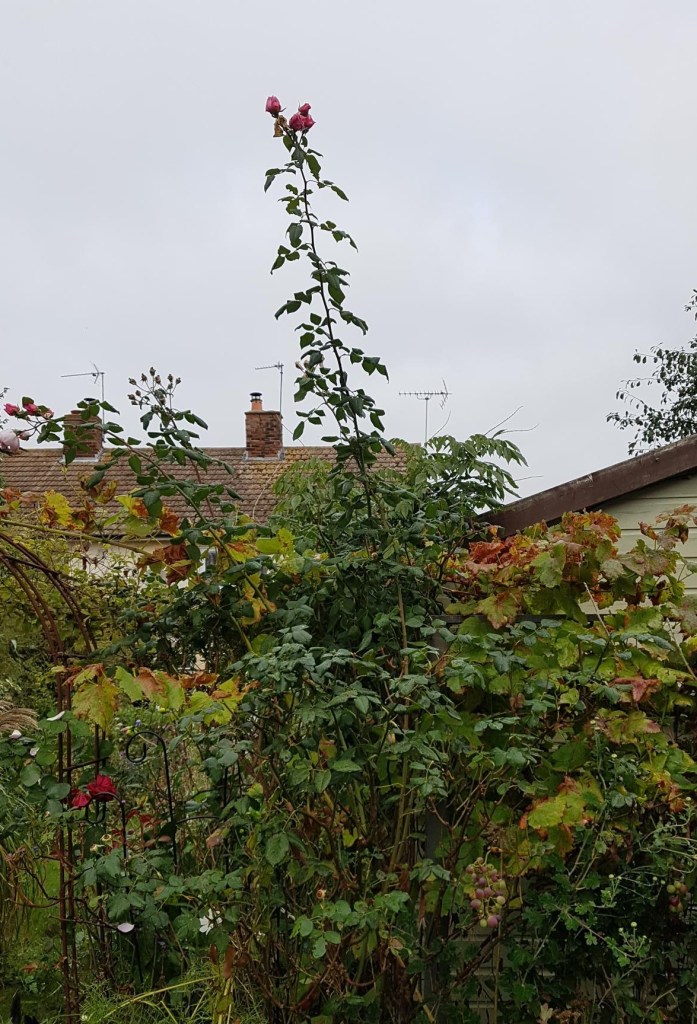 It got a bit blowy in October, so I need to prune back some of my roses, which thanks to feeding all summer have reached 8 or 9 feet in some cases. Windrock could loosen their roots or snap stems, so I’ll take the tallest ones back by about a third – I can tidy them up in early spring with their first proper prune.