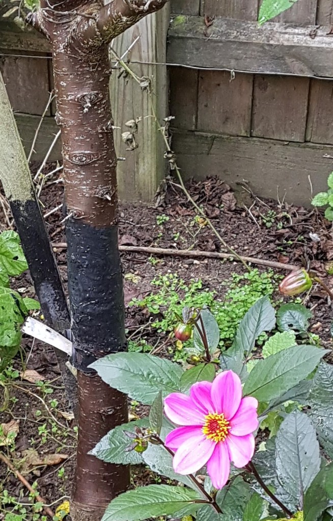 In the mini-orchard, I’ve been slapping sticky grease around the trunks of trees to try and control winter moths from laying eggs (that lead to maggots in fruit). I wear disposable gloves to wipe it on with my hand, but you can use an old paint brush (you won’t be able to paint with it after though) or tie grease bands around it (slightly more expensive and I think uglier than the grease which weathers in quickly).