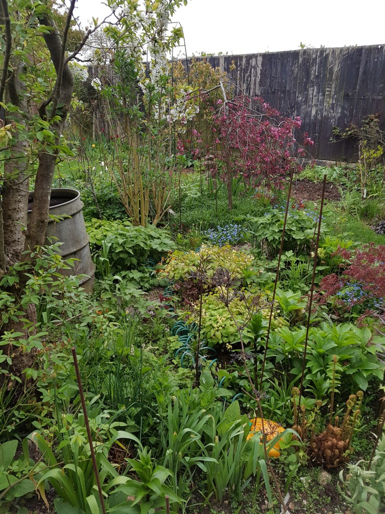 The garden’s in full on growth mode now. Everywhere I look something is shooting up or spreading out, which of course means weeds need pulling up or hoeing off (if the weather stays dry), stems need supporting and something always – always – needs pruning.