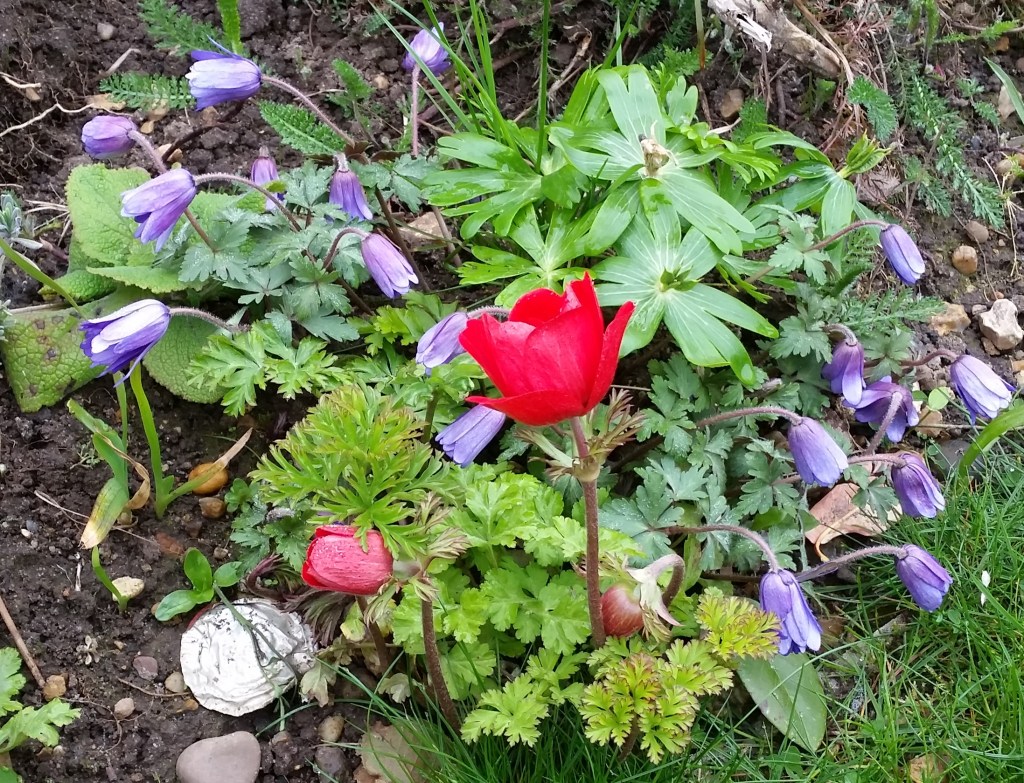Many of the bulbs are still going strong and, alongside the usual, two anemones are looking especially good: the soft blue Anemone blanda alongside the stronger jewel tones of Anemone cornaria. The petals of the red coronaria contrast with the blue of the blanda, but there’s also a touch of blue around its boss of stamens that complements perfectly.