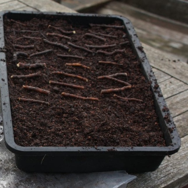 Choose vigorous shoots from this year’s growth and cut the tip out (it’ll only wilt) and then make 15-30cm lengths. Cut just below a bud at the bottom of each length, then dip the bottom in hormone rooting compound. Insert the cutting in a prepared trench in a spare bit of ground (make it an out of the way spot as they’ll take a while to root) or into a deep plant pot so about a third is above the surface.