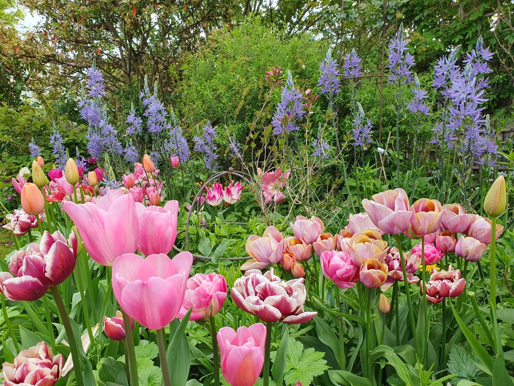 I’ve been exceptionally pleased with the display of tulips I planted late last autumn – delicate shades of pink, peach and apricot contrasted the blue Camassia leichtlinii and have been utterly glorious. But they’re done now, and I’ve cut back the stems so the leaves blend better among the rest of the planting while they slowly die back. Once the foliage has yellowed, I can safely cut them back to ground level.