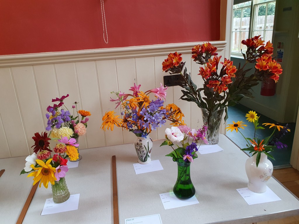 Class 11 was another popular class for exhibitors keen to show five stems of hardy perennials in a vase. People entered with five of the same perennial, alstroemeria for instance, and arrangement of five different kinds or a mix. On the table, they made for a display as good as those we saw in the flower arranging classes.