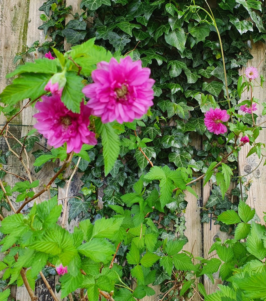 Trees and shrubs like Amelanchier lamarckii and Spiraea ‘Arguta’ are blossoming, and I’ve a great ornamental bramble, Rubus spectabilis ‘Olympic Double’, offering rose-like flowers towards the end of the month. There are spires of blue Camassia and low-growing Aubrieta ‘Purple Cascade’, and in shadier parts white and deep-red Lamprocapnos (or Dicentra) spectabilis.