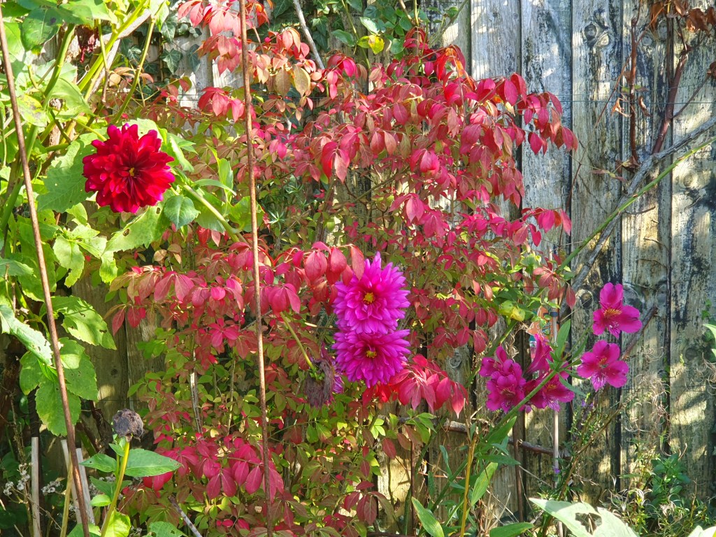 Plumes of Miscanthus grasses glow red and silver in the sun, alongside asters and sedums giving bees the last of the nectar to turn into winter stores. Although the chill may be ending some perennial flowers, it’s also turning my Euonymous alatus – the winged spindle or burning bush – shades of deep pink and red. Last year, I even had some grapes on a vine in the middle of the month.