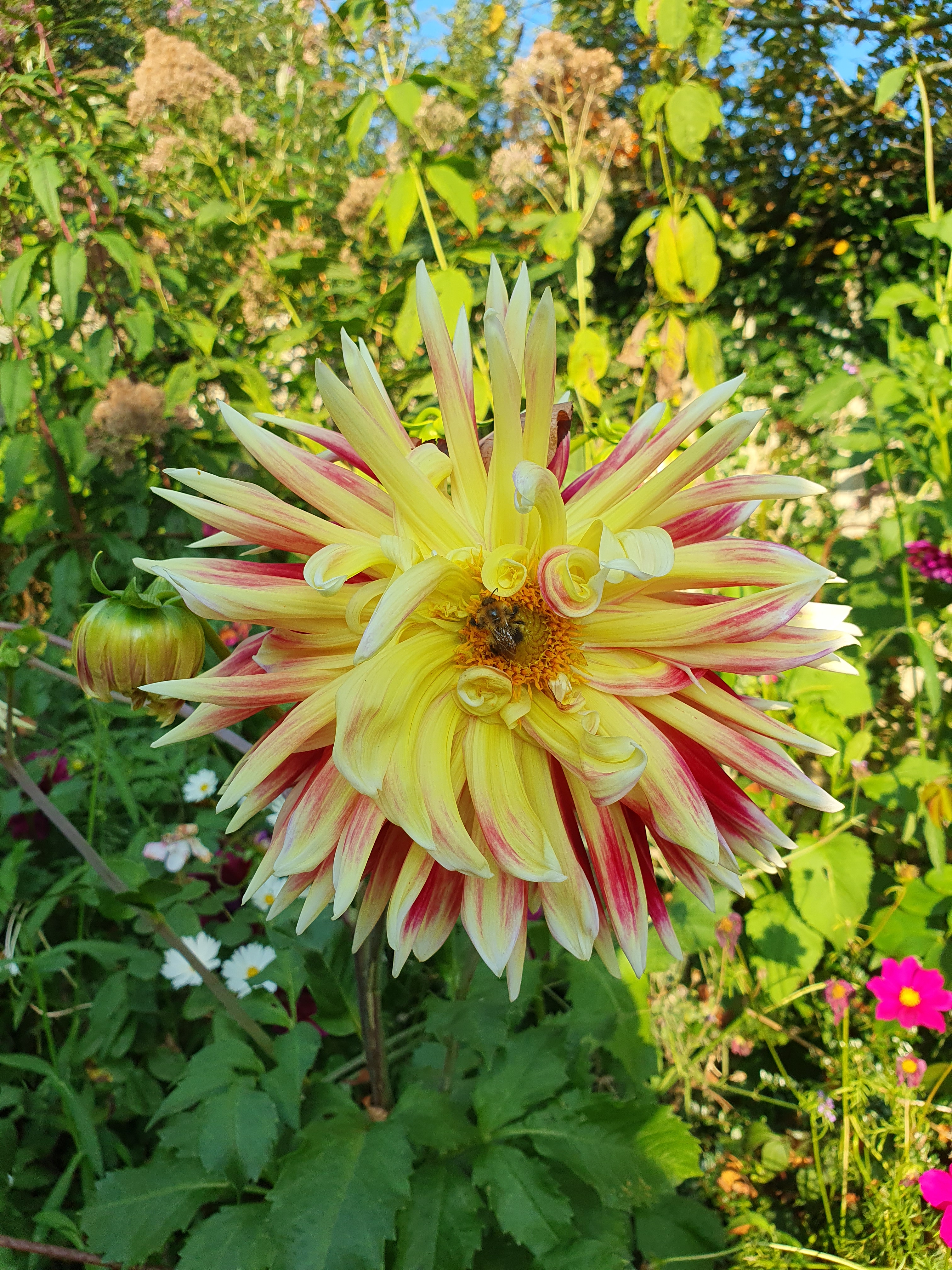 The garden right now is full of autumn colour. The dahlias have struggled a bit with the heatwaves and a lack of water but have started to catch up now. I’d say they are still a bit shorter than they have been. They are complimented by clumps of hardy pink chrysanthemums, the feathery foliage of cosmos in white, pinks and reds, while little jewel-like flowers of salvias shine around the stems of roses.
