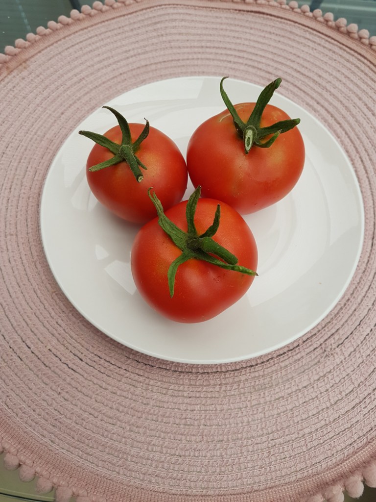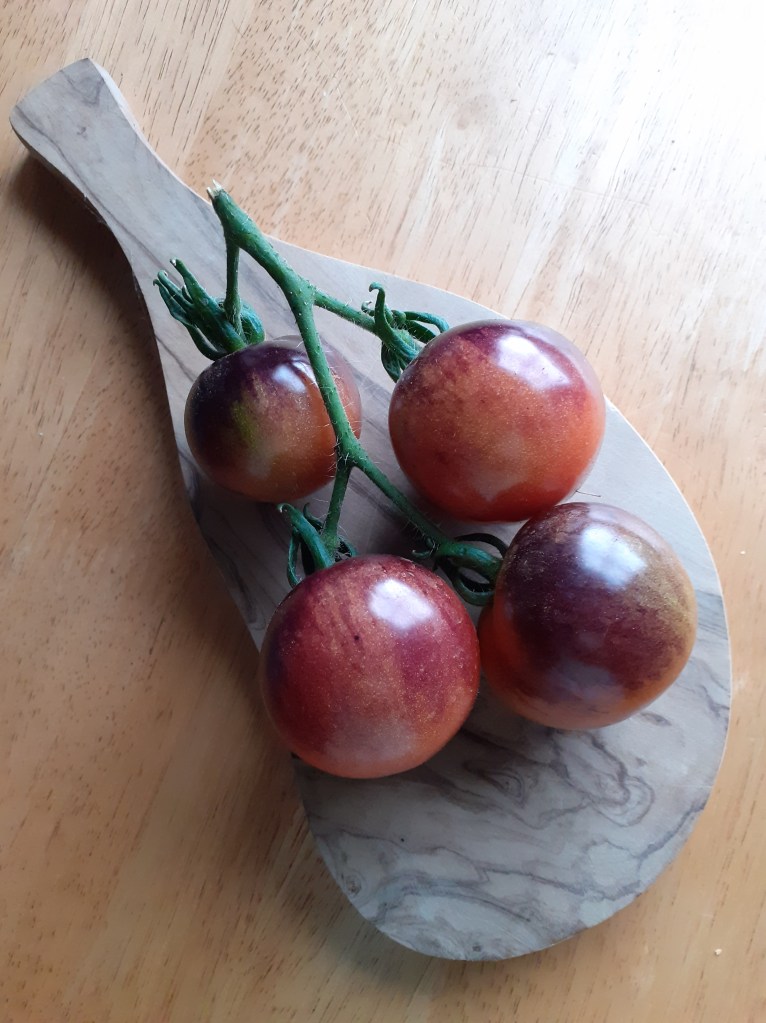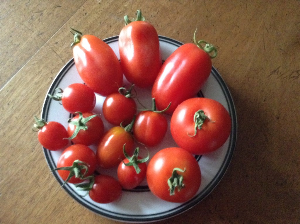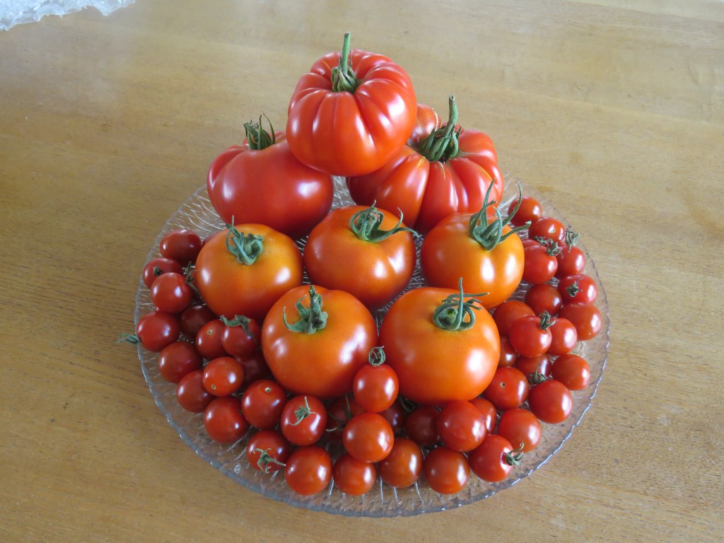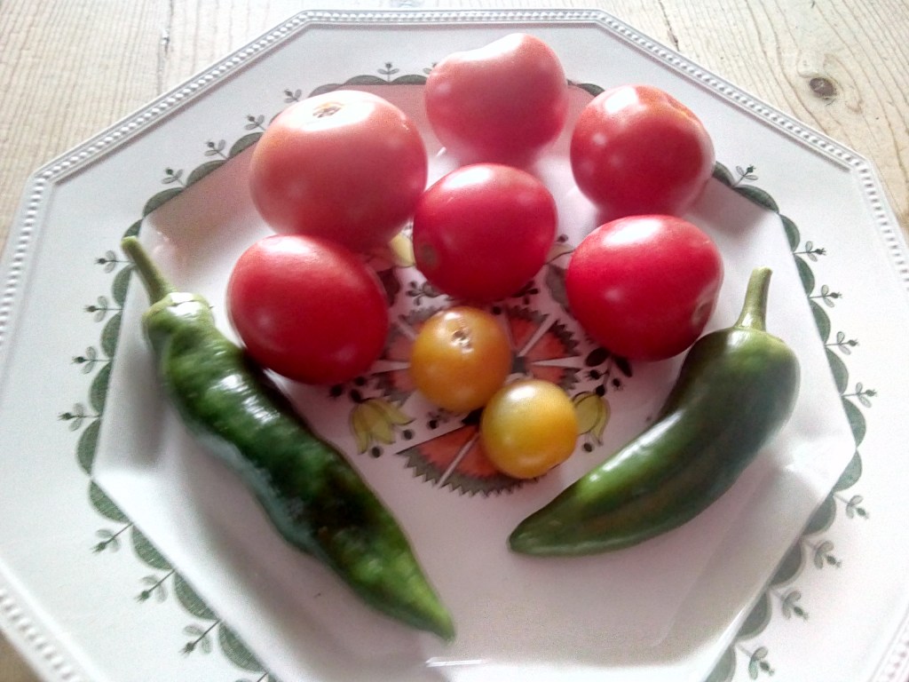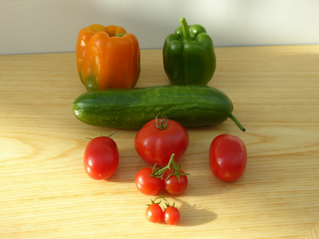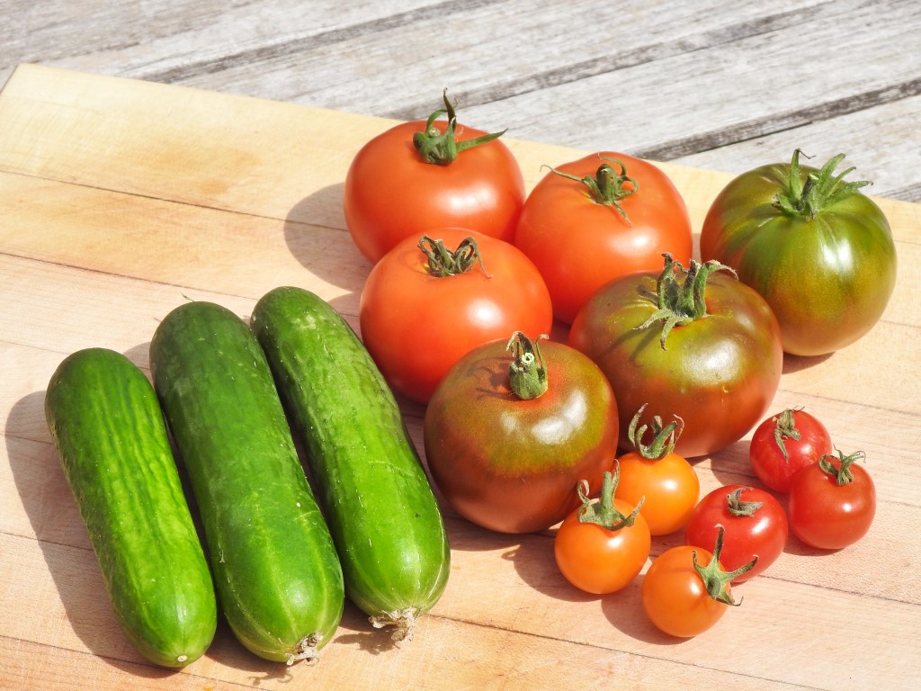A selection of tomatoes and/or cucumbers and/or peppers displayed on a plate, board or bench