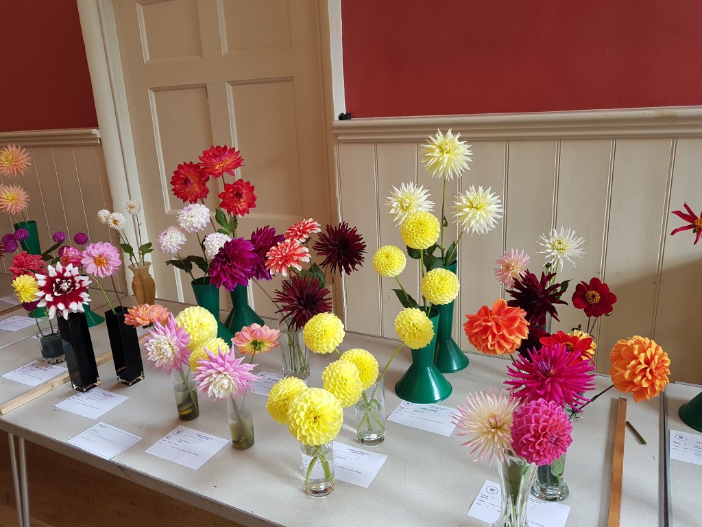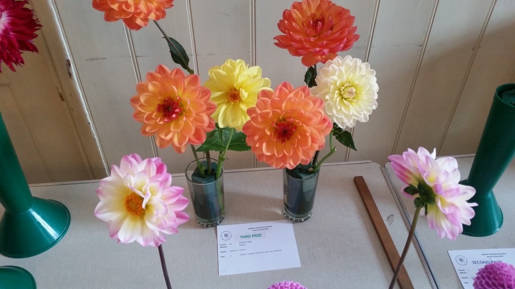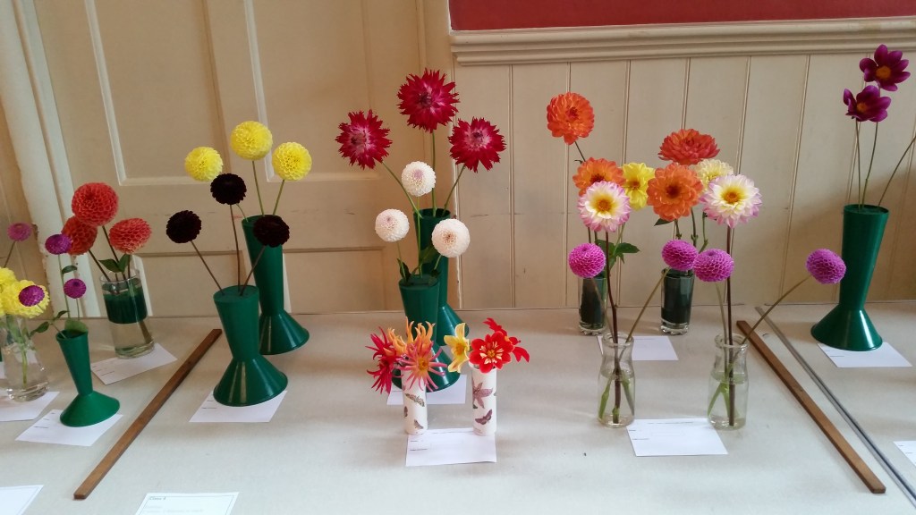 To enter this class you just need six dahlias. They can be any type you like, just put three in each vase. Most exhibitors make the blooms in one vase the same as the blooms in the second, but you don’t have to.