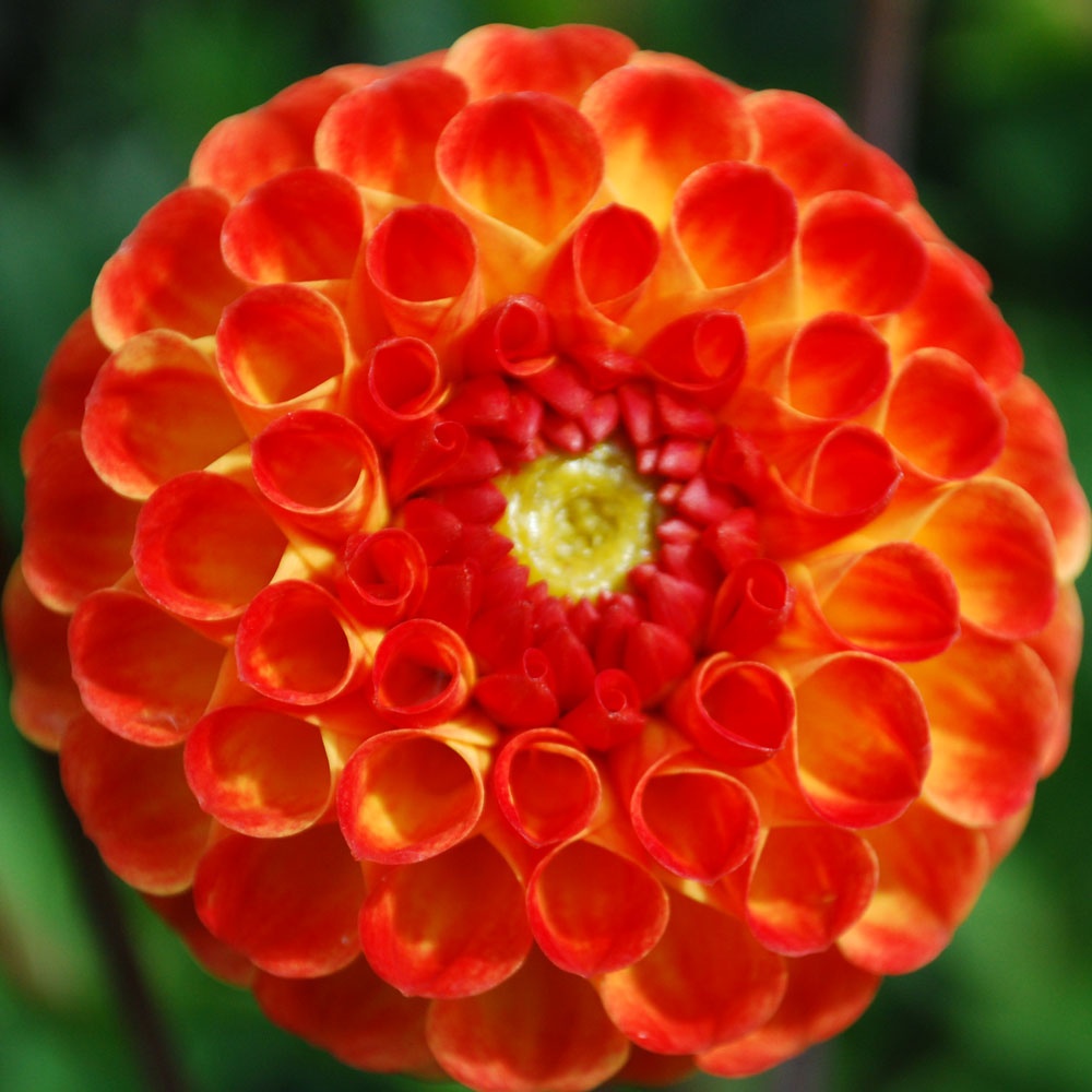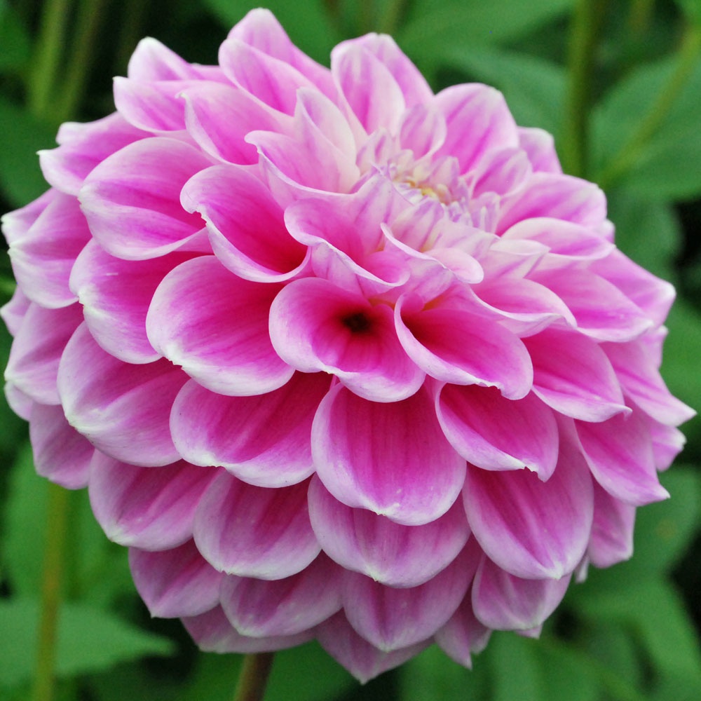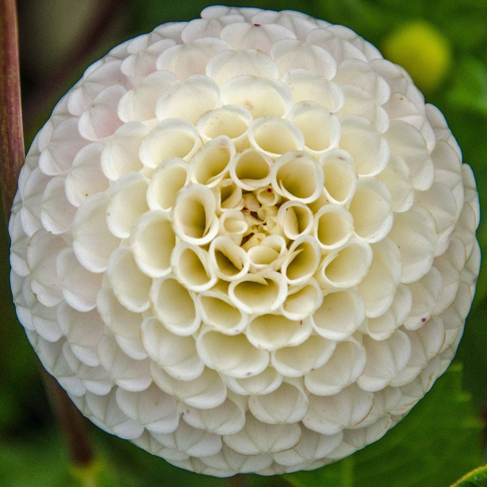 Ball dahlias have a slightly flattened top, with blunt or rounded petals arranged in a spiral pattern.