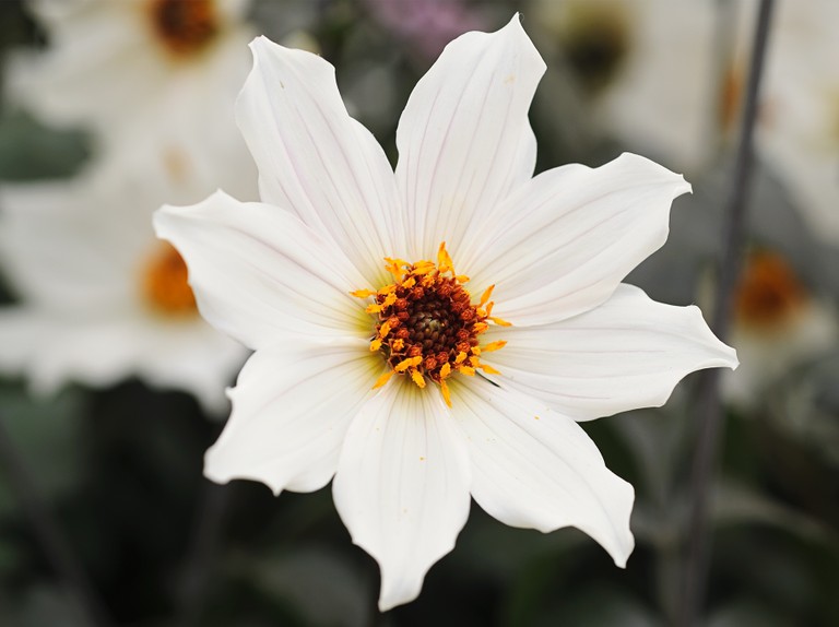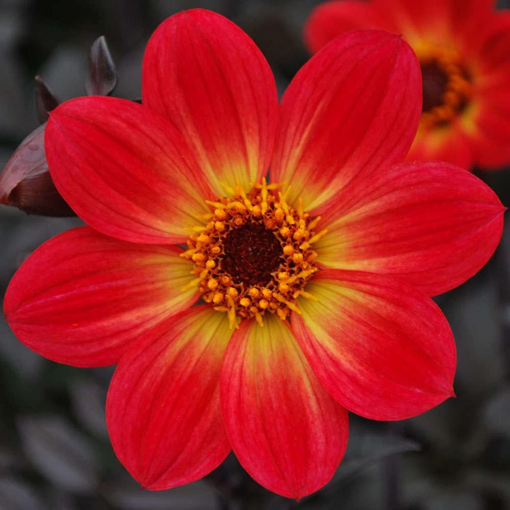 Collerette dahlias have blooms with a single outer ring of generally flat ray florets, which must overlap, with a ring of small florets (the ‘collar’) the centre forming a disc.