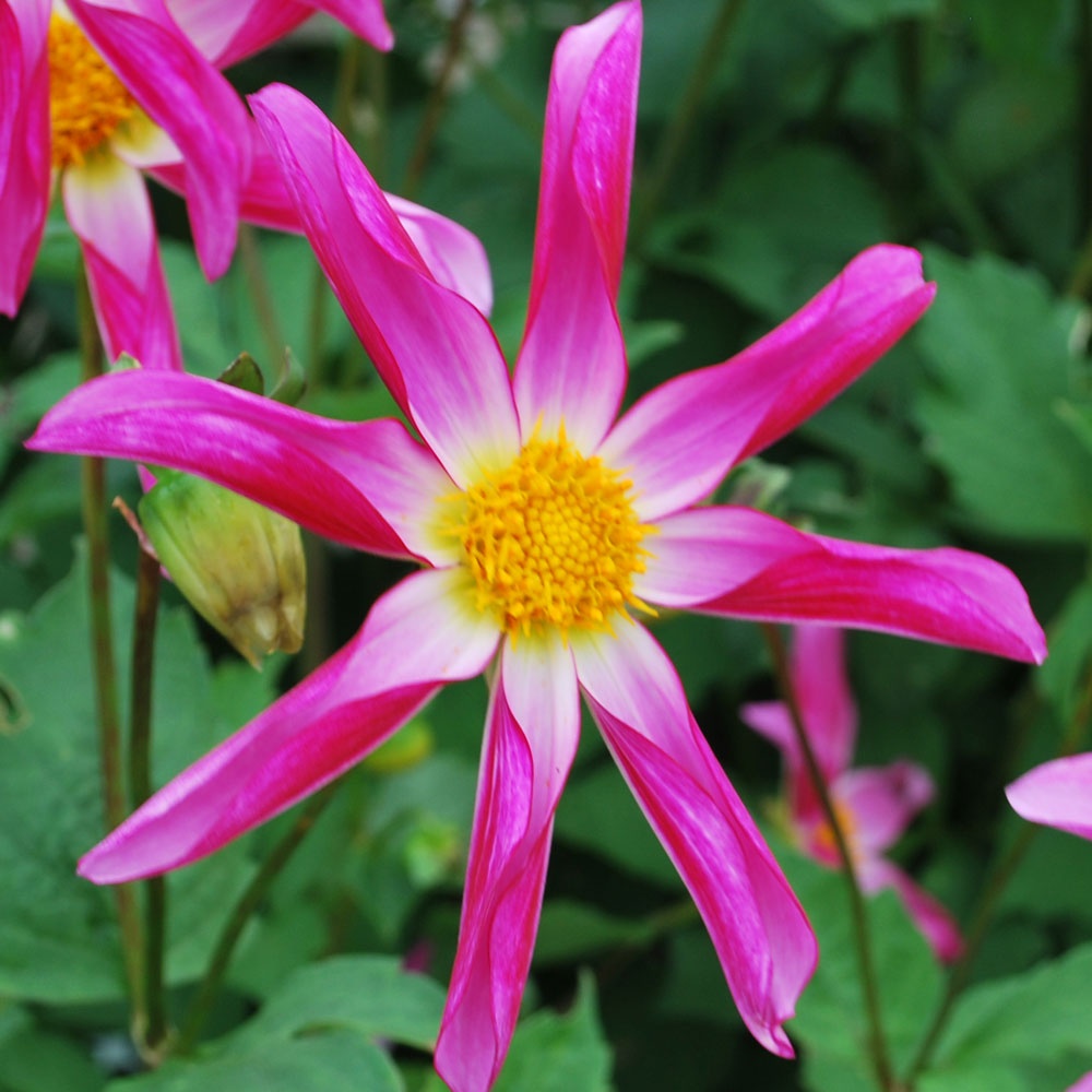 Star (or Orchid) dahlias have blooms with a single outer ring of florets surrounding the disc. Ray florets are uniformly either involute or revolute.